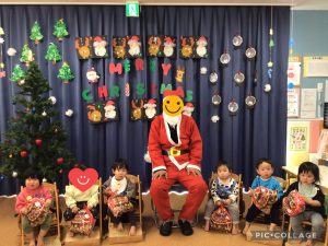 サンタさんに少しドキドキしているお友だちもいましたが、プレゼントをもらうと、可愛らしい笑顔を見る事が出来ましたよ!