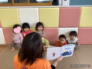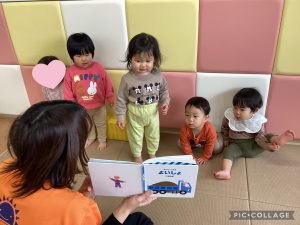 絵本の時間が始まることに気がつくと「これよんでー!」と絵本を持ってきてくれる子どもたちです😊