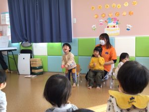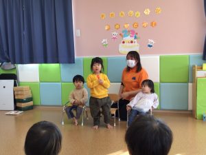 入場の音楽が聞こえてくると、初めはちょっぴりドキドキした表情のお友だち💓保育者と一緒にお名前と好きな食べ物、何歳になったのかを発表してくれましたよ🎵
