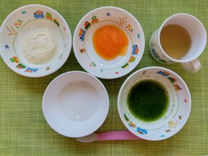 (写真は後期食です。離乳食は、離乳食の段階ごと固さ、切り方、量を変えて提供しています。)