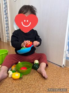 りんご組さんが使っているおもちゃを借りて、おままごとを楽しみました!沢山の野菜と果物のおもちゃを見て大興奮でしたよ🎵