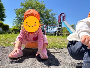新しく入園したお友だちは砂遊びを楽しみました!砂の感触が心地良かったようでいい笑顔を見る事が出来ました😊