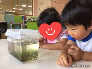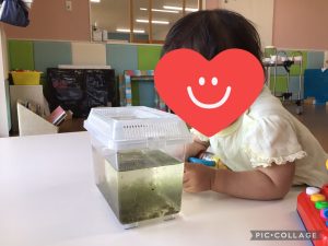 先日園の田んぼを覗いてみると、オタマジャクシが泳いでいました!まだ小さいオタマジャクシだったので、虫かごに入れて観察をしてみました👀