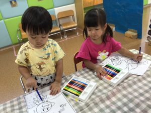 お友だちと次は何色にするのか、何色で塗ったのかを話しながら楽しく塗り絵をしているりんご組さんでした🍎