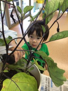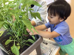 いちご組のお友だちもナスの収穫に挑戦してみました。「おっきい〜」と嬉しそうな笑顔を見る事が出来ました🎵