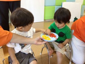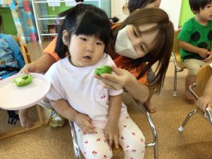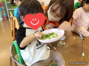 もも組のお友だちは細かく切られたピーマンに興味津々でした!初めは触る事に抵抗があったようですが、年上のお友だちの姿を見て、「わたしも!」と触っていましたよ✨