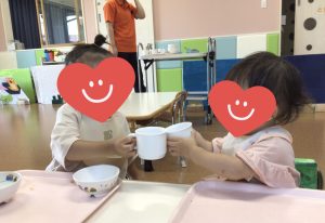 乾杯をしてからお茶を飲む事にハマっているもも組のお友だち。年上のお友だちと給食を食べると必ず乾杯しています✨