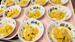 (親子行事の関係で、午後おやつの時間に在園する園児さんが少ない場合は市販菓子の提供となります。)