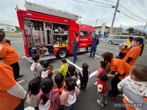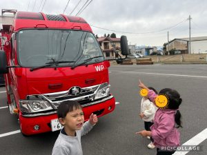 訓練の後は、消防車見学をさせてもらいました。消防車の中はどんな風になっているのか教えてもらい、「これはなに?」と質問が止まらないほど興味津々な子ども達でした✨