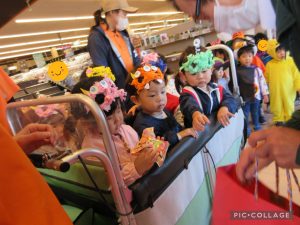 おやつを食べた後は、近くのお店へトリックオアトリートをしに出掛けました!「おかしもらえるかなあ」とワクワクしているお友だちでした🎵