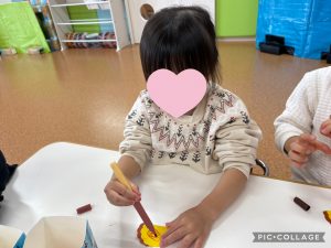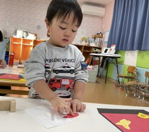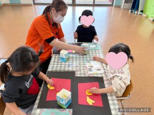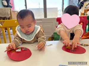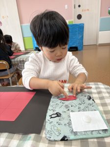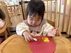 糊を使う事も上手になってきたりんご組さん。1の指で少量の糊を取り、丁寧に塗っていましたよ🎵