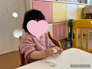 初めは千切る事が難しかったもも組さん。引っ張ってみたり、振ってみたりなど試行錯誤しながら、一生懸命千切っていましたよ🎵