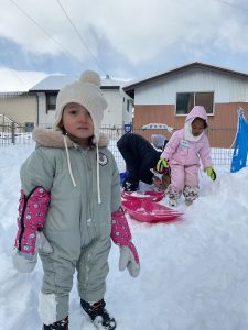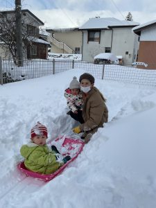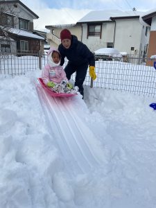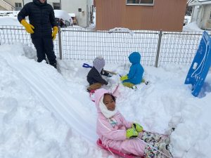 たくさん積もった園庭の雪山でソリ遊びをしました🛷