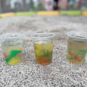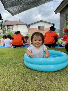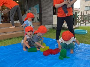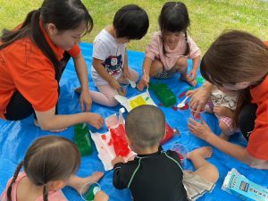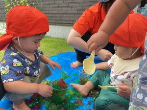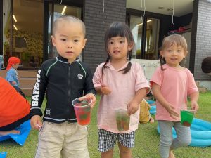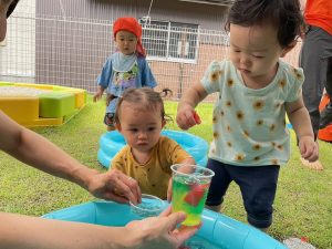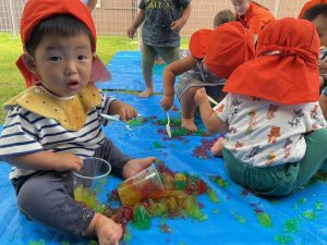 園庭にみんな出て色付き寒天を使って感触遊びを楽しみました✨