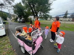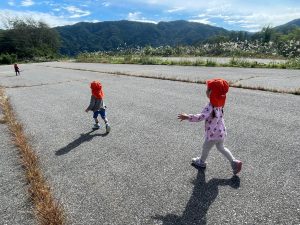 りんご組さんは少し遠出して松川沿いのヘリポートまでおでかけです