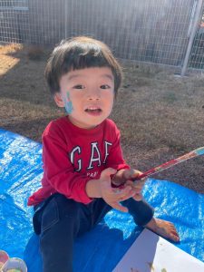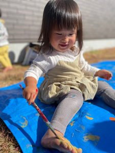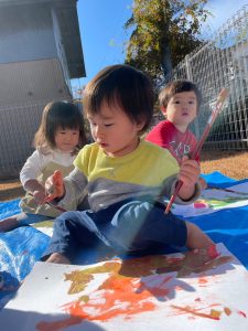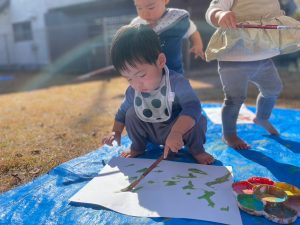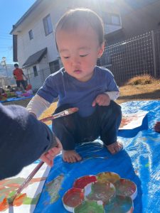 温かい日だったので園庭で絵の具遊びをしましたよ🎨