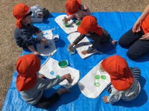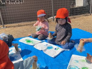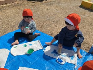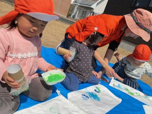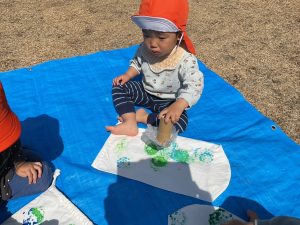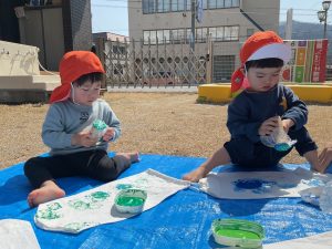 良いお天気だったのでお外で絵の具を使った制作活動です✨