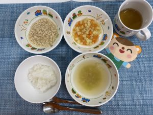 (写真は離乳食後期です。年齢によって形、固さ、盛り付け量を変えて、提供しています。)