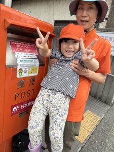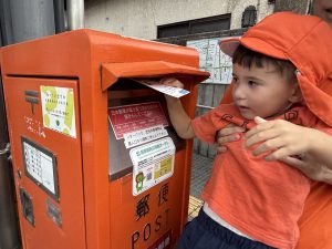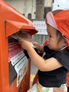 ポストに出しに行くのはみんなで行きました。ポストにお手紙を入れるのは初めての子もいて、ちょっと緊張気味だったり、嬉しくてニコニコしながら出したり、いろんな表情の子どもたちが見れました![]()