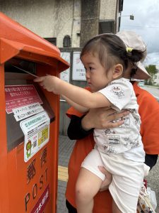 お友だちの中には、海を超えて外国のおじいちゃん、おばあちゃんに届く葉書もあります。小さなポストから、近くのおじいちゃん、おばあちゃんだけでなく、遠くのおじいちゃん、おばあちゃんにも届けられるなんて、素敵![]()
