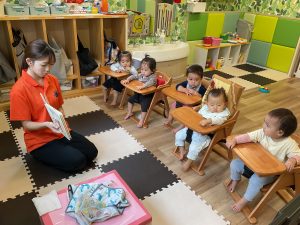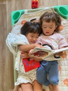 午睡明け、楽しそうに2人で絵本を読みあいっこ。