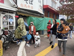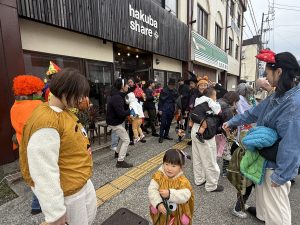 いつもお散歩している白馬の商店街の道を歩きながら、協力してくださったお店を回って「trick or treat!」と言えたらお菓子をget! さあて、言えるかなあ〜。
