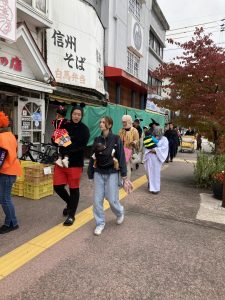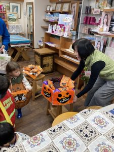 いつもお散歩している白馬の商店街の道を歩きながら、協力してくださったお店を回って「trick or treat!」と言えたらお菓子をget! さあて、言えるかなあ〜。