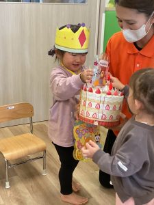 大好きなキャラクターや絵本の主人公が出てきて、みんな大喜び。最後の箱からはおおきなケーキも出てきて、みんなで happy birthday♪ を歌いました。