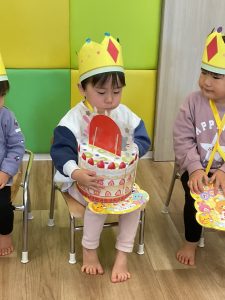 今週は11月生まれのお友だちのお誕生日会がありました。11月はいちご組の女の子とりんご組の男の子、女の子の3人のお友だちのお祝いをしました。