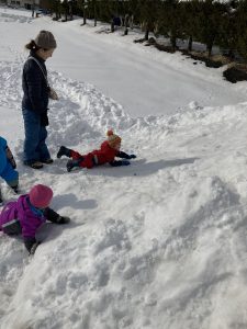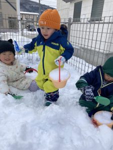 園庭では除雪した雪がどんどん高くなり、よじ登ったり、歩き回ったり、やっほー!と叫んでみたり、雪でレストランをしたりと好きな遊びをどんどん見つけて賑やかに遊びます☺︎