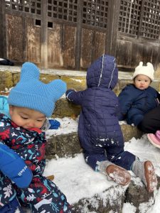 近所の神社も素敵な遊び場です♡ もも組さんも逞しく雪遊び♪