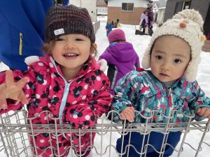 園庭では除雪した雪がどんどん高くなり、よじ登ったり、歩き回ったり、やっほー!と叫んでみたり、雪でレストランをしたりと好きな遊びをどんどん見つけて賑やかに遊びます☺︎
