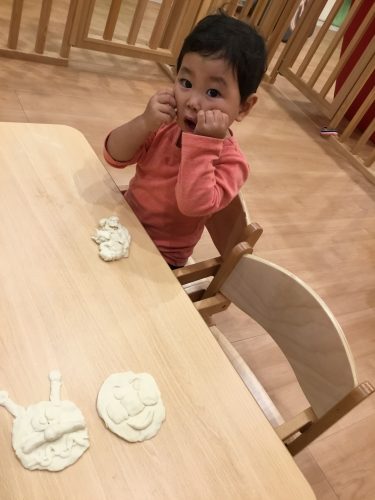 お指でツンツンしたり「まるまる~♪」と言いながらお団子やおにぎりも作ってみたりと保育士も一緒に楽しみ