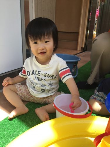 もも組さんのお友だちは初めてのお水遊びに少し不安そうに保育士のところに来て両手を上げて“抱っこしてよ~”のポ-ズで