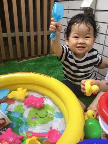 今週はずっと楽しみにしていた水遊びが始まりました。白山園のエントランス前にプ-ルやたらいを並べた中にお魚やお船をぷかぷかと~