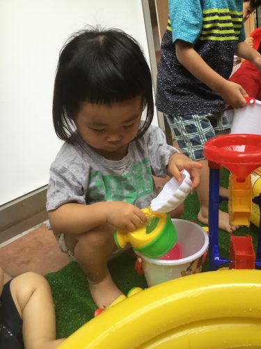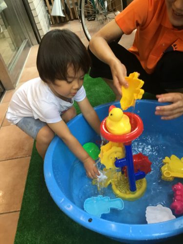 ちょっぴりドキドキ!!!仲良くプ-ルの周りに座って、水車にお水を入れて流れてくる様子を、手をたたきながら喜んでみる姿や