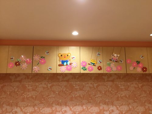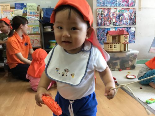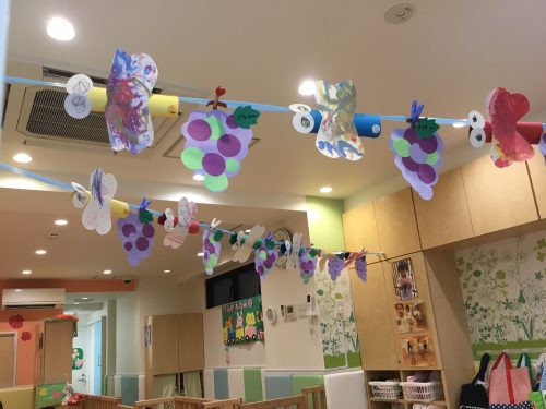 9月に入り、夕方のお散歩では心地よい秋の風がふいたり、保育室の壁面にはコスモス畑を赤とんぼが嬉しそうに飛んだりと