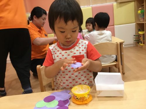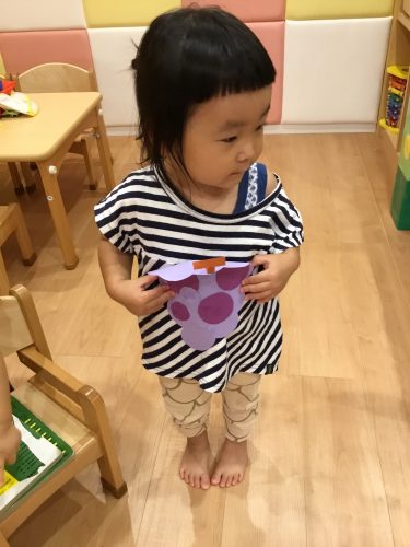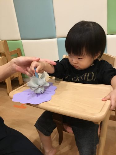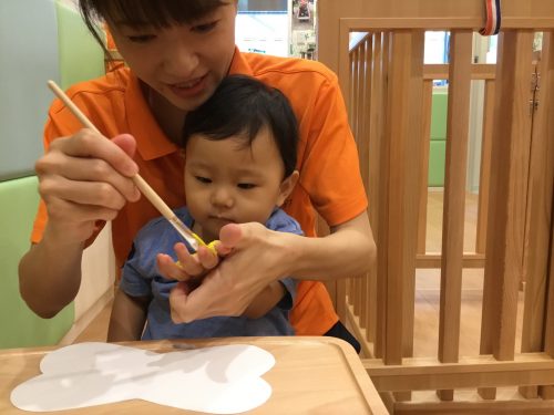 もも組さんはとんぼの羽を小さな可愛いおててに絵の具を付けて手形スタンプでペタリ![]()