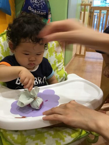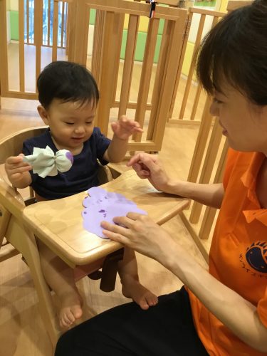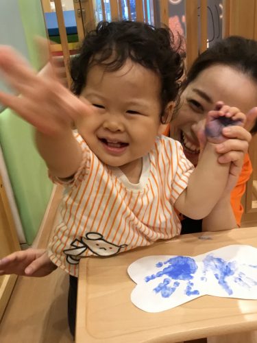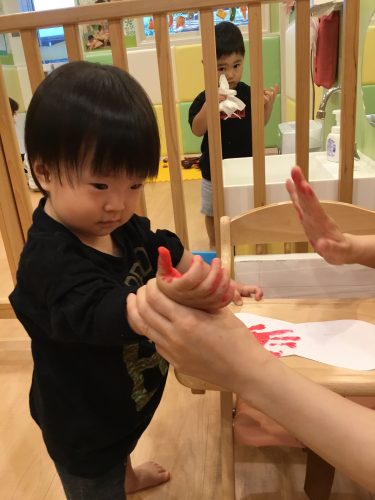 手のひらに絵の具をつけてもらうと嬉しそうにじいいい~と
