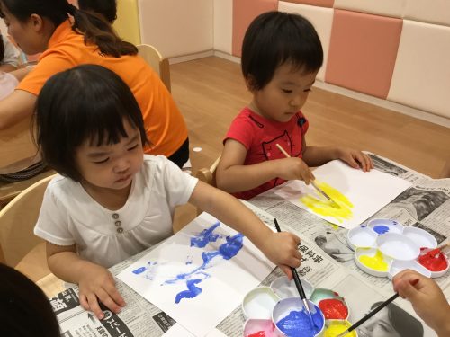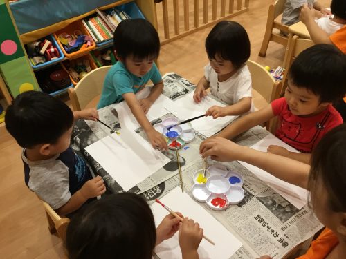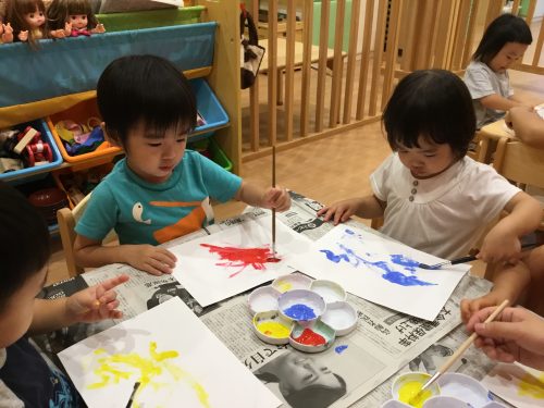 りんご組さんは、自分で好きな色の絵の具をうれしそうに選びながら