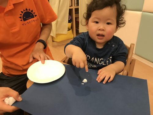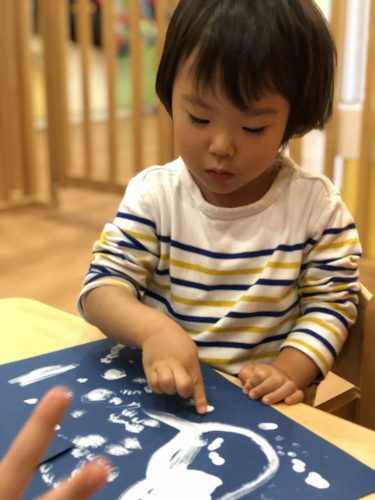 そこで最初の製作は、ネイビ-の色画用紙に白い絵の具を指につけて”フィンガ~ペインティング”で