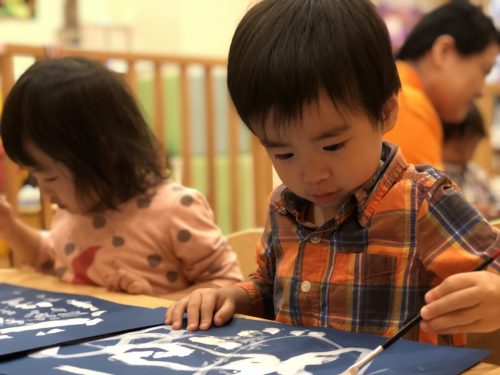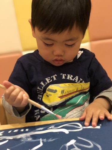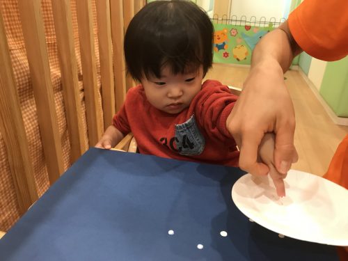 雪を降らせてみました。以前は絵の具を手につけることに抵抗のあったお子様も今では何の躊躇もなくペタペタと楽しそうに,沢山 ”雪” を降らせてくれました。