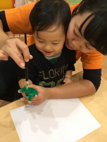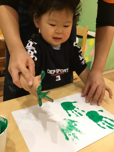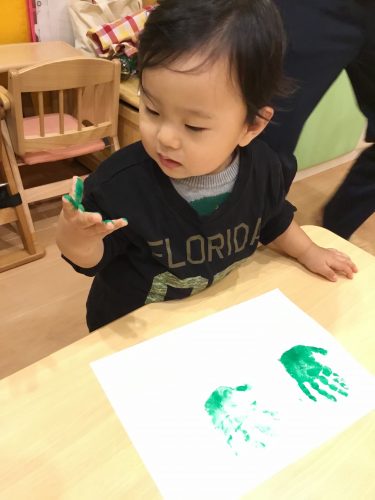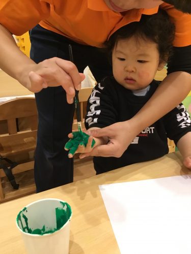 もも組さんのお友だちは小さな“おててに“緑色の絵の具をつけて