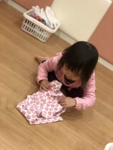 りんご組さんのお友だちのお着替えの様子からお伝えさせて頂きます。りんご組さんは、いま自分で着脱、収納の取り組みを頑張っているところです。最初は脱いだ衣類を、ひっくり返して、おたたみをする事もとても難しく「う~~ん