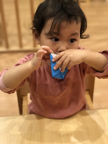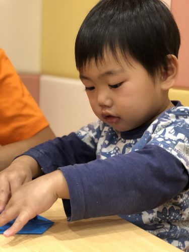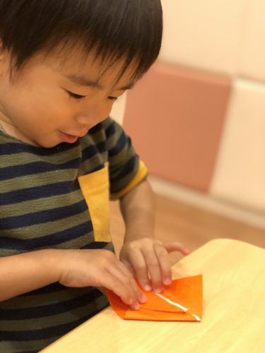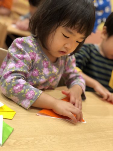 まず最初は三角折りからスタ-トです。折り紙の合わせる部分に丸印をつけて目印にしながら角と角を合わせて「アイロンをぎゅうっと掛けます(*^^*)」の声掛けと保育者の真似をしながら「ぎゅう~とね」といいながら折り紙の線の部分を折る姿や、いつも以上に集中しながら折ろうとしている姿も見られました。