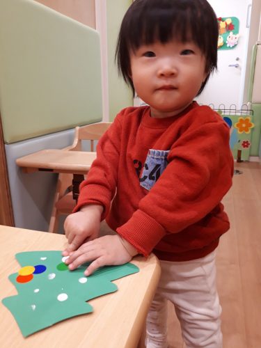 クリスマスツリ-に色とりどりのシ-ルをぺたり。こんなに可愛いツリ-になりました