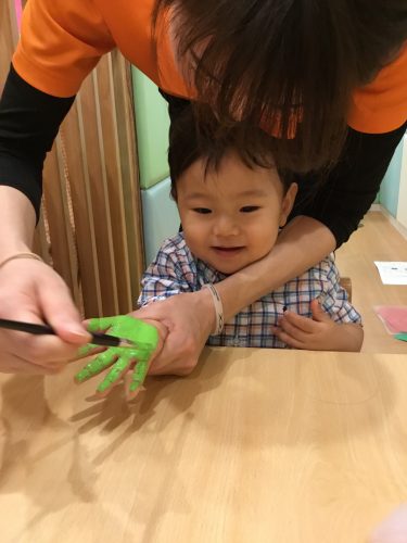 もも組さんのお友だちも可愛い小さなおててで手形スタンプでツリ-![]()