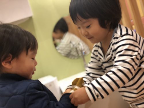 りんご組さんの優しいお姉さんがいちご組さんのお友だちに優しくそ~っと手袋をはめてくれる姿に”ほっこり”と暖かい気持ちになりました![]()