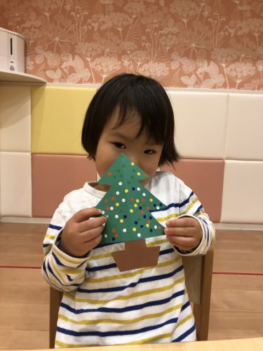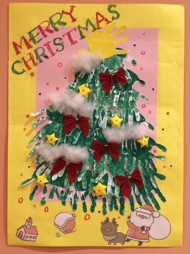 ?クリスマスツリ-はお子様たちの手形スタンプでこんなに可愛いらしいクリスマスツリ-になりました。