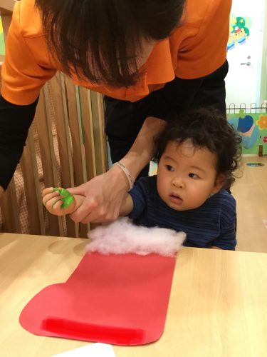 を置く保育室にぶら下げました。コットに横になって”赤いブ-ツ”を指差す姿もまた可愛らしいひと場面でした![]()